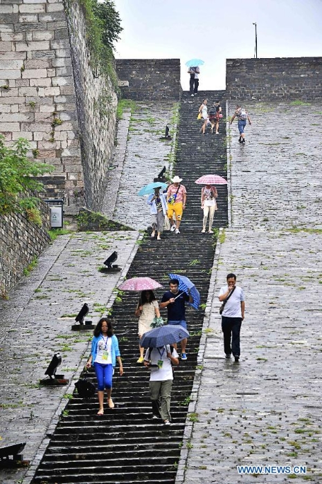 Travelers visit Zhonghua Gate of the Ming Dynasty city wall on Aug. 13, 2014. The 2nd Summer Youth Olympic Games will kiss off on August 16 in Nanjing, capital of east China's Jiangsu Province. (Xinhua/Yue Yuewei)