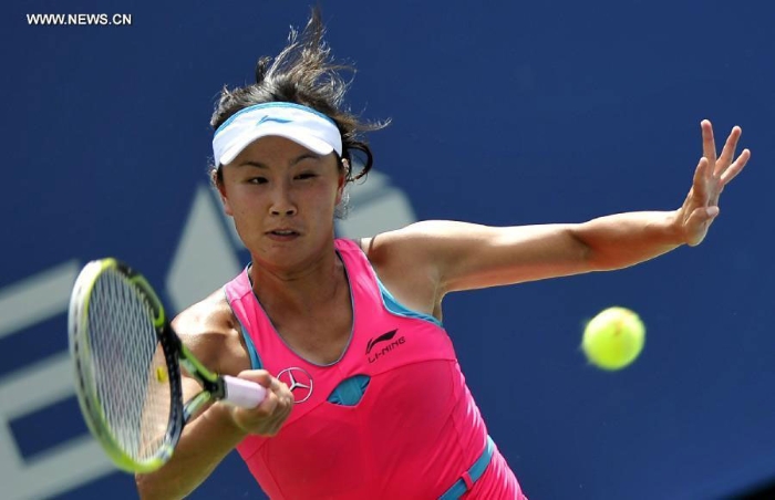 Peng Shuai of China returns a shot during the women's singles quarterfinal match against Belinda Bencic of Switzerland at the 2014 U.S. Open in New York, the United States, on September 2, 2014. Peng Shuai won 2-0. [Photo: Xinhua/Wang Lei]