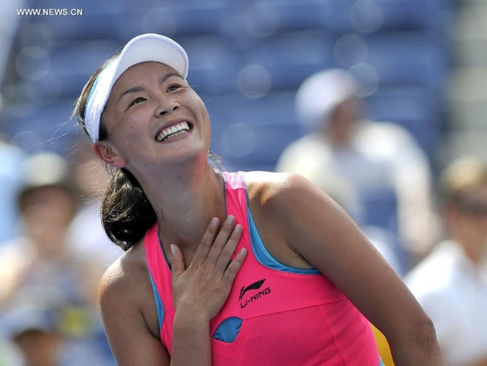 Peng Shuai of China reacts after the women's singles quarterfinal match against Belinda Bencic of Switzerland at the 2014 U.S. Open in New York, the United States, on September 2, 2014. Peng Shuai won 2-0. [Photo: Xinhua/Wang Lei]