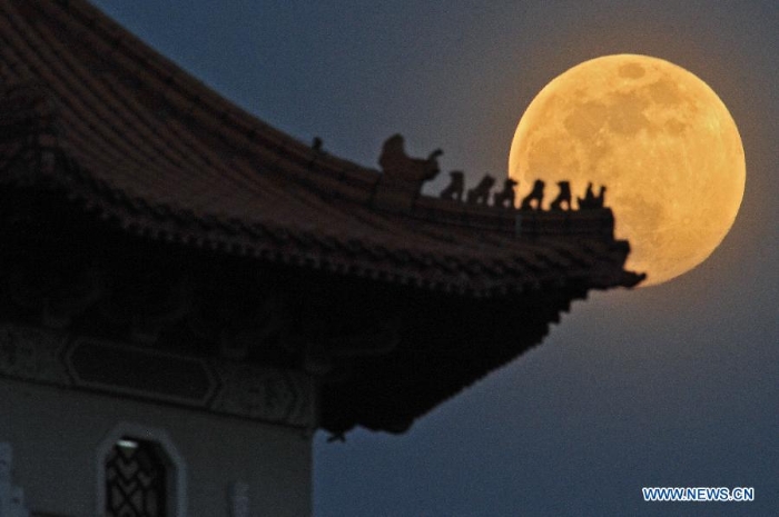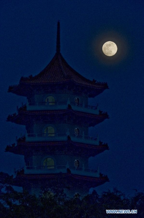 Photo taken on Sept. 8, 2014 shows a full moon rise over Singapore's Chinese Garden. People of Singapore celebrates Mid-Autumn Festival on Monday.(Xinhua/Then Chih Wey)