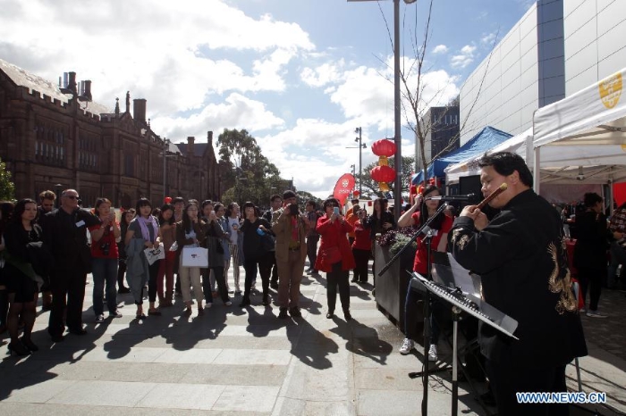 Chinese flute performer Chai Changning performs during a gathering on the occasion of the Mid-Autumn Festival at the Sydney University, Sept. 8, 2014. The Mid-Autumn Festival, which falls on Sept. 8 this year, is a traditional Chinese festival for family reunions, during which folks will enjoy the full moon together and eat mooncakes. (Xinhua/Jin Linpeng)
