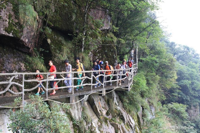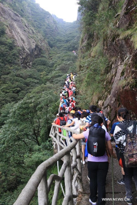 Travellers go hiking during the 7th Camping Festival of Mountain Wugong in Pingxiang, east China's Jiangxi Province, Sept. 13, 2014. The two-day camping from Sept. 13 to 14 attracted thousands of travellers all around the nation. (Xinhua/Wen Meiliang)