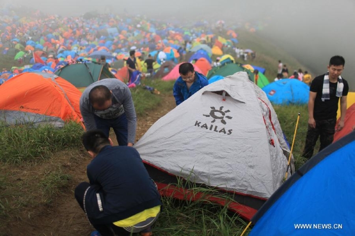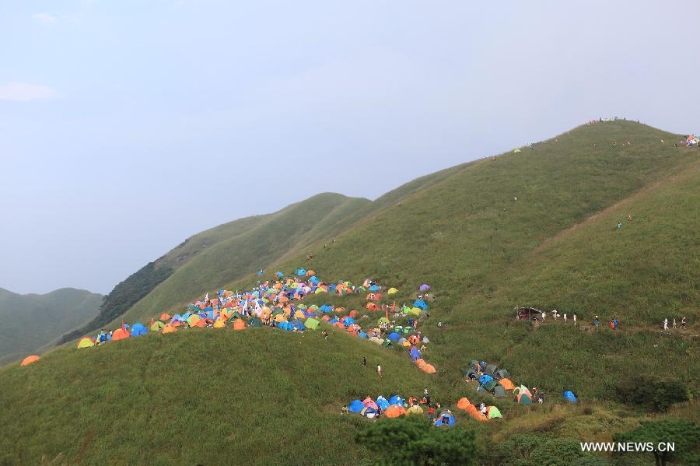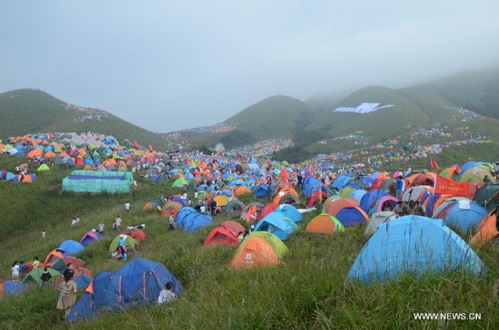 Travellers take part in the 7th Camping Festival of Mountain Wugong in Pingxiang, east China's Jiangxi Province, Sept. 13, 2014. The two-day camping from Sept. 13 to 14 attracted thousands of travellers all around the nation. (Xinhua/Wen Meiliang)