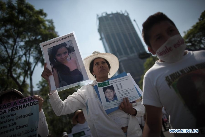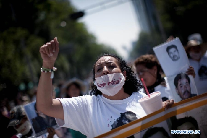 Residents take part in a protest in Mexico City, capital of Mexico, on May 10, 2015. Hundreds of Mexican mothers seeking their missing children marched Sunday in Mexico City in the framework of the Mother's Day. (Xinhua/Pedro Mera)