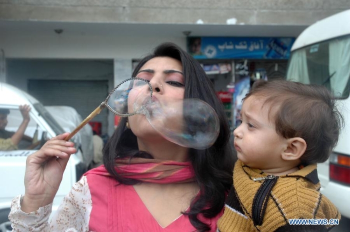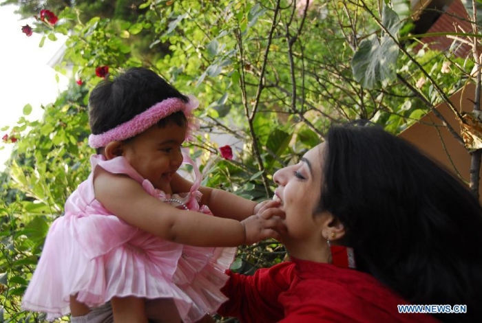 A Pakistani mother plays with her child in Islamabad, capital of Pakistan, on May 10, 2015, the Mother's Day. (Xinhua/Saadia Seher)