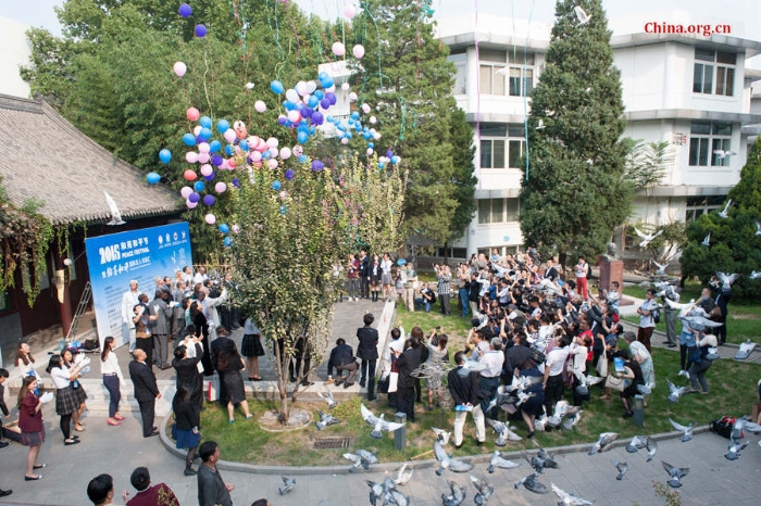 Balloons and pigeons are let loose at the 2015 Peace Festival held at Beijing No. 4 High School on Sept. 21, 2015, to commemorate the International Day for Peace, which falls on this day. [Photo by Chen Boyuan / China.org.cn]