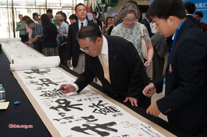 Japanese Ambassador to China Masato Kitera offers his autograph on a long Chinese calligraphy scroll at the 2015 Peace Festival held at Beijing No. 4 High School on Sept. 21, 2015, to commemorate the International Day for Peace, which falls on this day.