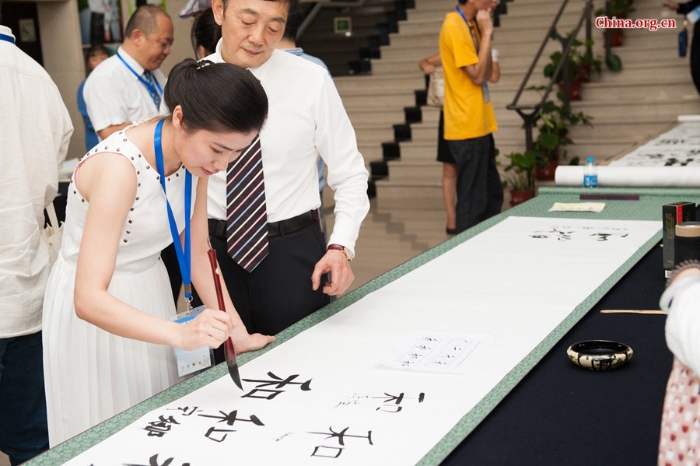 Virah Linchanthara, a Thai student studying in China writes the Chinese characterhe,which means peace and harmony, with an ink brush on a long calligraphy scroll at the 2015 Peace Festival held at Beijing No. 4 High School on Sept. 21, 2015, to commemorate the International Day for Peace, which falls on this day. [Photo by Chen Boyuan / China.org.cn]