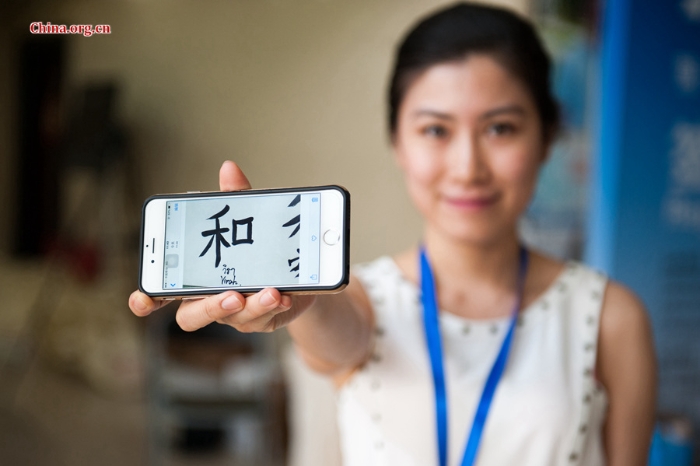 Virah Linchanthara, a Thai student studying in China showcases her ink brush calligraphy of the Chinese characterhe, which means peace and harmony, at the 2015 Peace Festival held at Beijing No. 4 High School on Sept. 21, 2015, to commemorate the International Day for Peace, which falls on this day. [Photo by Chen Boyuan / China.org.cn]