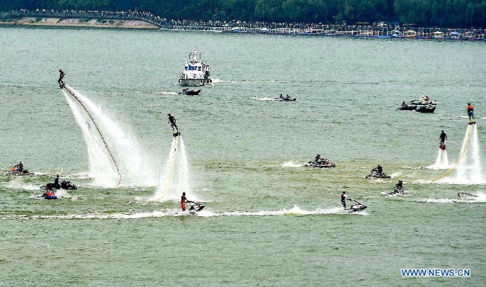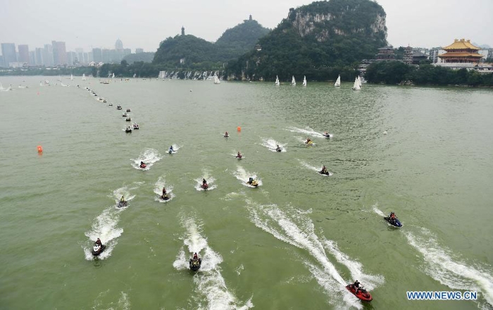 People ride on speedboats during a parade to celebrate the National Day in Liuzhou, south China's Guangxi Zhuang Autonomous Region, on Oct. 1, 2015. [Photo: Xinhua]