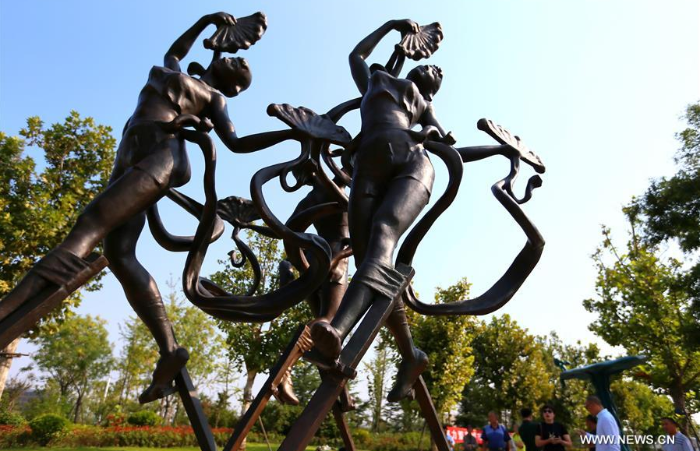 Visitors pass by sculptor Zhu Shangxi's work "Celebrations" at the 2016 Qingdao International Sculpture Festival in Jimo, a county-level city in Qingdao, east China's Shandong Province, Sept. 22, 2016. Sculptors from more than 20 countries and regions participated in the festival kicked off on Thursday, with 85 sculptures. (Xinhua/Liao Xiaopeng)