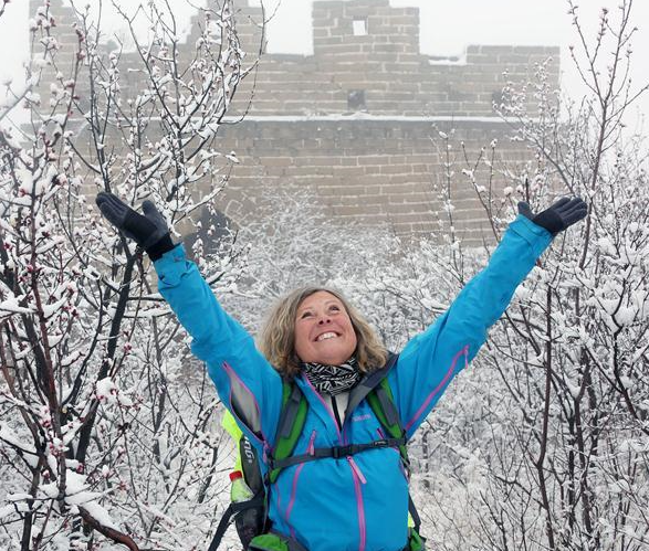 A foreign tourist poses for photos at snow-covered Huanghuacheng Lakeside Great Wall Reserve in the suburban district of Huairou in Beijing, capital of China, March 24, 2017. A snowfall hit the district on Friday. (Xinhua/Bu Xiangdong)