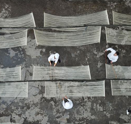 A worker prepares partly finished hollow noodles for an airing process at a noodle-making company in Suiyang county of southwest China's Guizhou Province, March 6, 2018. Under a market-oriented production mode, Suiyang's traditional hollow noodle has been turned into a profitable business that helps increase local employment rate and personal income. (Xinhua/Ou Dongqu)