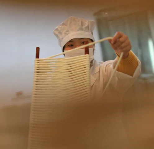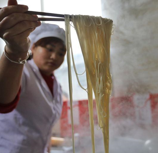 A worker demonstrates boiled hollow noodles at a noodle-making company in Suiyang county of southwest China's Guizhou Province, March 6, 2018. Under a market-oriented production mode, Suiyang's traditional hollow noodle has been turned into a profitable business that helps increase local employment rate and personal income. (Xinhua/Ou Dongqu)