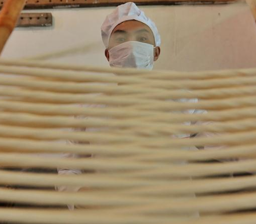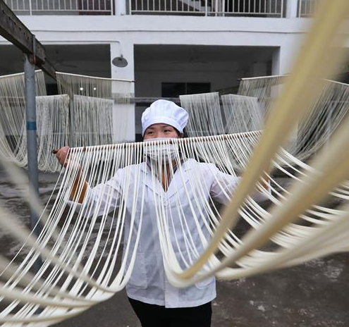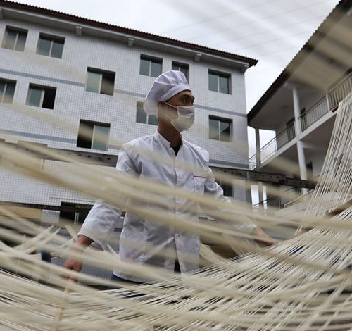 A worker arranges partly finished hollow noodles for further processing at a noodle-making company in Suiyang county of southwest China's Guizhou Province, March 6, 2018. Under a market-oriented production mode, Suiyang's traditional hollow noodle has been turned into a profitable business that helps increase local employment rate and personal income. (Xinhua/Ou Dongqu)