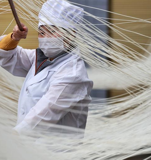 A worker winds partly finished hollow noodles onto a wooden stand for further processing at a noodle-making company in Suiyang county of southwest China's Guizhou Province, March 6, 2018. Under a market-oriented production mode, Suiyang's traditional hollow noodle has been turned into a profitable business that helps increase local employment rate and personal income. (Xinhua/Ou Dongqu)
