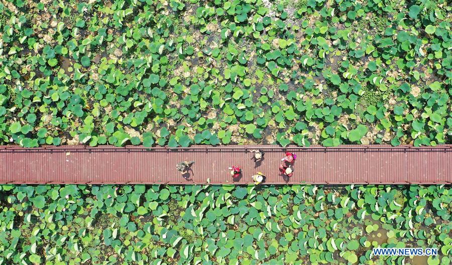 Aerial photo taken on June 12, 2020 shows tourists viewing lotus flowers at Lianwei Town in Xinjian District of Nanchang City, east China's Jiangxi Province. Nanchang has encouraged farmers and specialized cooperatives to raise crayfish in lotus ponds so as to increase incomes. (Xinhua/Peng Zhaozhi)