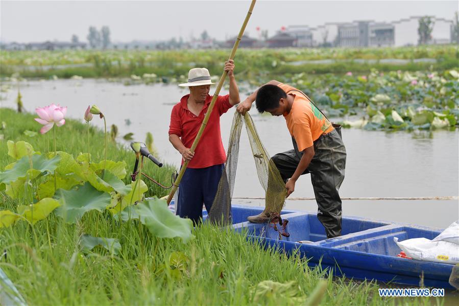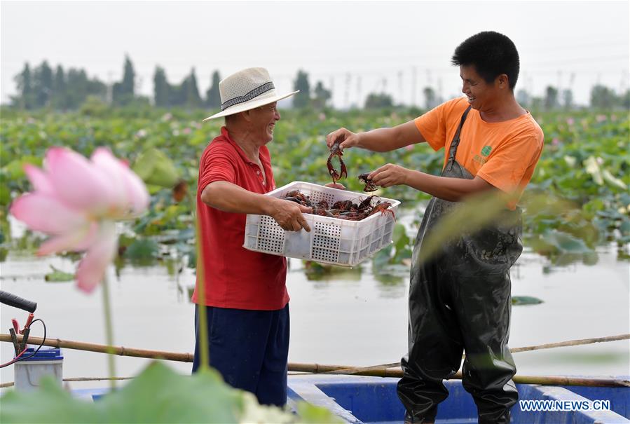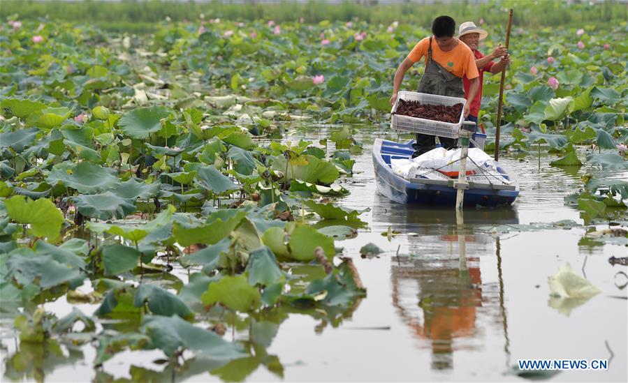 Farmers catch crayfish in a lotus pond at Lianwei Town in Xinjian District of Nanchang City, east China's Jiangxi Province, June 12, 2020. Nanchang has encouraged farmers and specialized cooperatives to raise crayfish in lotus ponds so as to increase incomes. (Xinhua/Peng Zhaozhi)