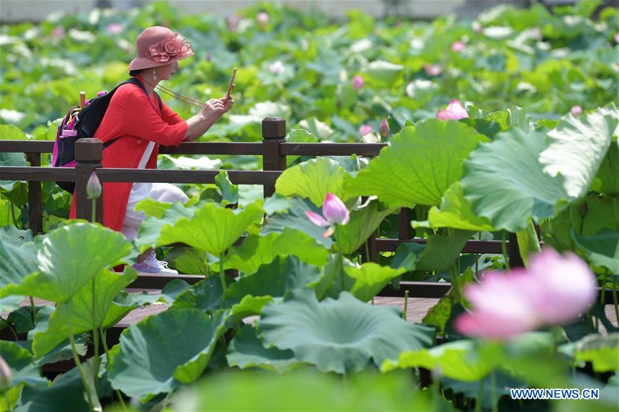 A tourist takes a photo of lotus flowers at Lianwei Town in Xinjian District of Nanchang City, east China's Jiangxi Province, June 12, 2020. Nanchang has encouraged farmers and specialized cooperatives to raise crayfish in lotus ponds so as to increase incomes. (Xinhua/Peng Zhaozhi)