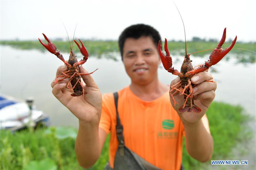 A farmer shows the crayfish he caught in a lotus pond at Lianwei Town in Xinjian District of Nanchang City, east China's Jiangxi Province, June 12, 2020. Nanchang has encouraged farmers and specialized cooperatives to raise crayfish in lotus ponds so as to increase incomes. (Xinhua/Peng Zhaozhi)