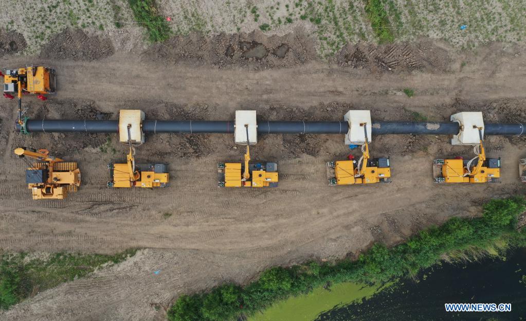Aerial photo taken on June 24, 2021 shows workers installing pipe sections at a construction site for the outbound pipeline of a liquefied natural gas (LNG) receiving station, in Wanglanzhuang Township, Fengnan District, Tangshan City of north China's Hebei Province. This 176.18-kilometer pipeline, when finished, is expected to duct natural gas from the Xintian LNG receiving station in Caofeidian District of Tangshan to Baodi District of Tianjin, also in north China. (Xinhua/Yang Shiyao)