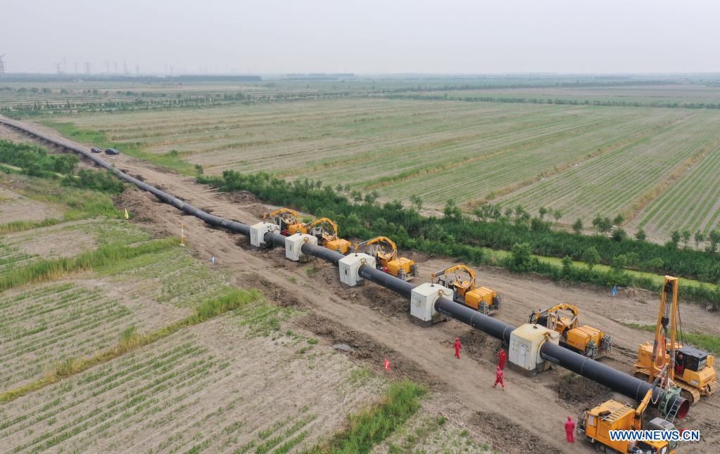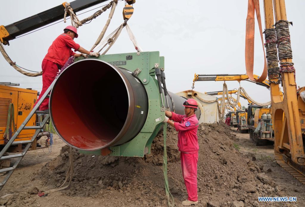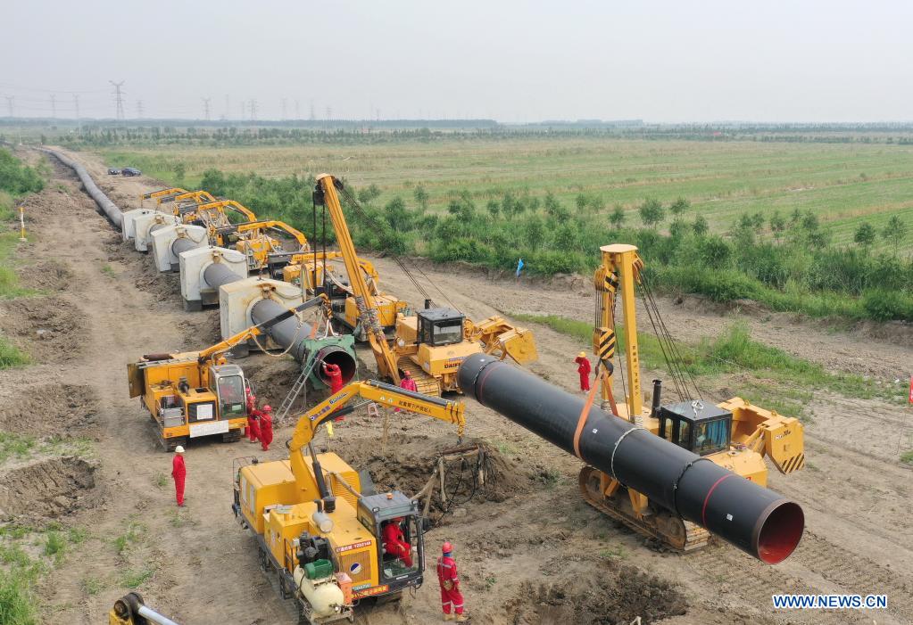 Workers install a pipe section at a construction site for the outbound pipeline of a liquefied natural gas (LNG) receiving station, in Wanglanzhuang Township, Fengnan District, Tangshan City of north China's Hebei Province, on June 24, 2021. This 176.18-kilometer pipeline, when finished, is expected to duct natural gas from the Xintian LNG receiving station in Caofeidian District of Tangshan to Baodi District of Tianjin, also in north China. (Xinhua/Yang Shiyao)