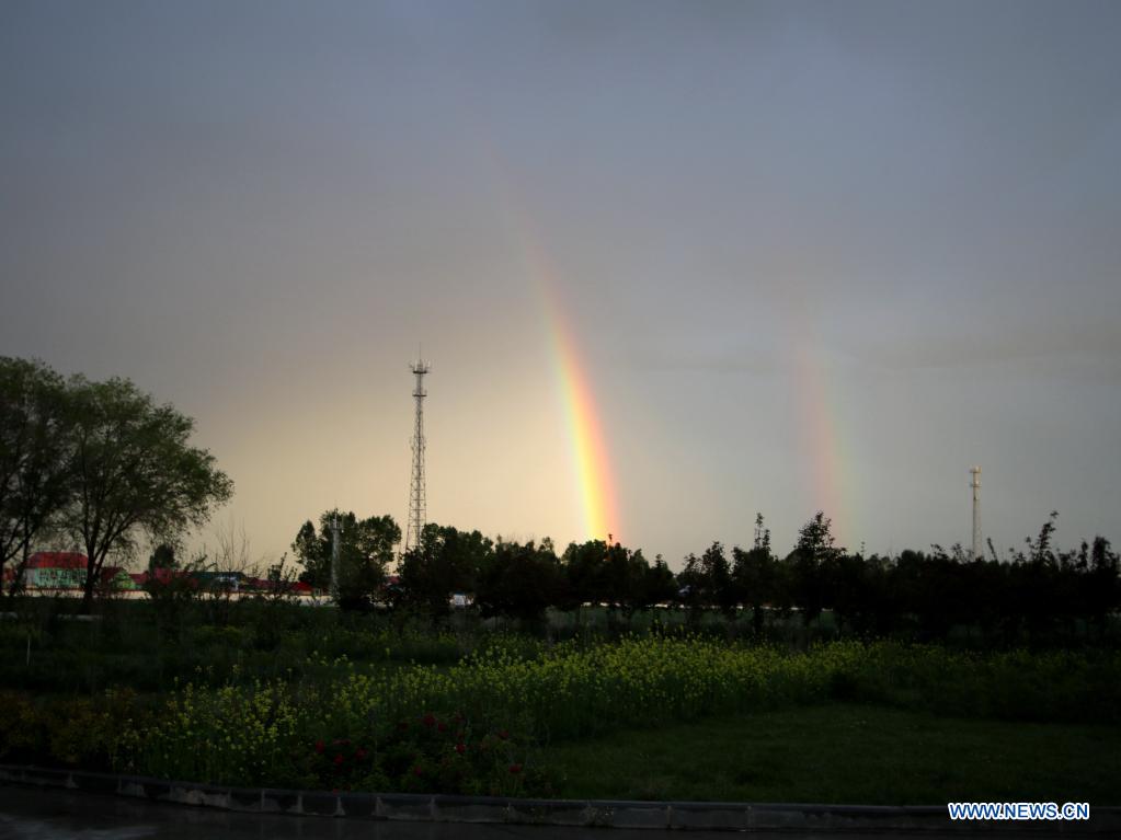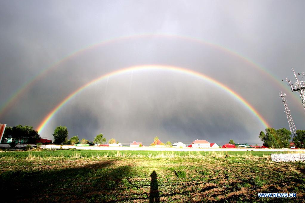 Photo taken on May 30, 2018 shows a double rainbow in Zhaosu County, northwest China's Xinjiang Uygur Autonomous Region. (Photo by Wang Liping/Xinhua)