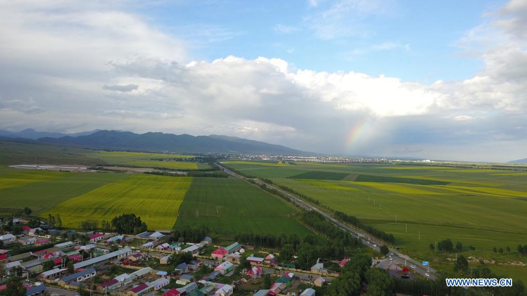 Aerial photo taken on July 17, 2021 shows a rainbow in Zhaosu County, northwest China's Xinjiang Uygur Autonomous Region. (Xinhua/Zhang Xiaocheng)