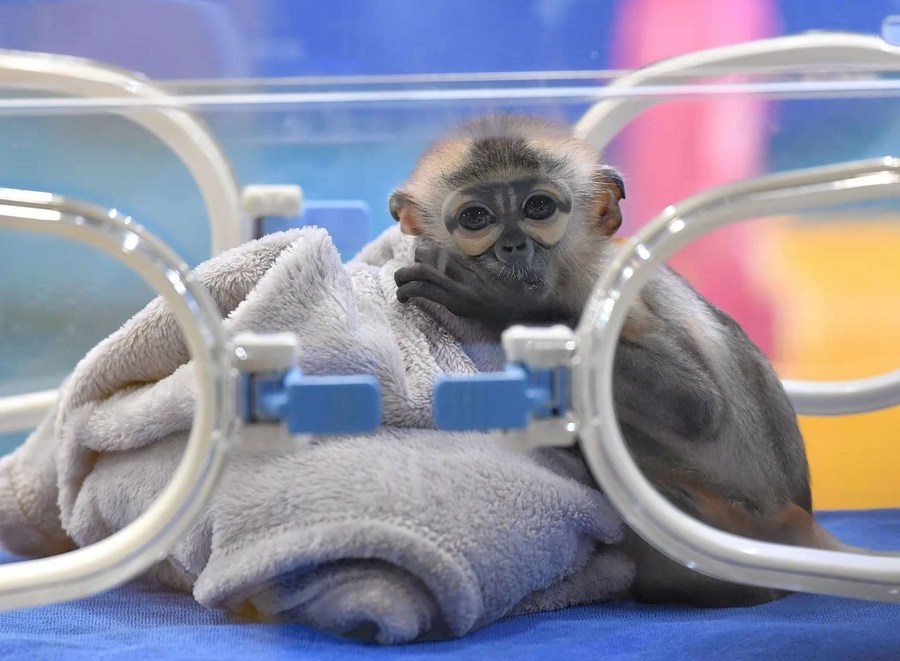 Photo taken on Nov 10, 2021 shows the newborn Black-shanked Douc Langur in an incubator at Chimelong Primate Research Center in Guangzhou, capital of South China's Guangdong province. [Photo/Xinhua]