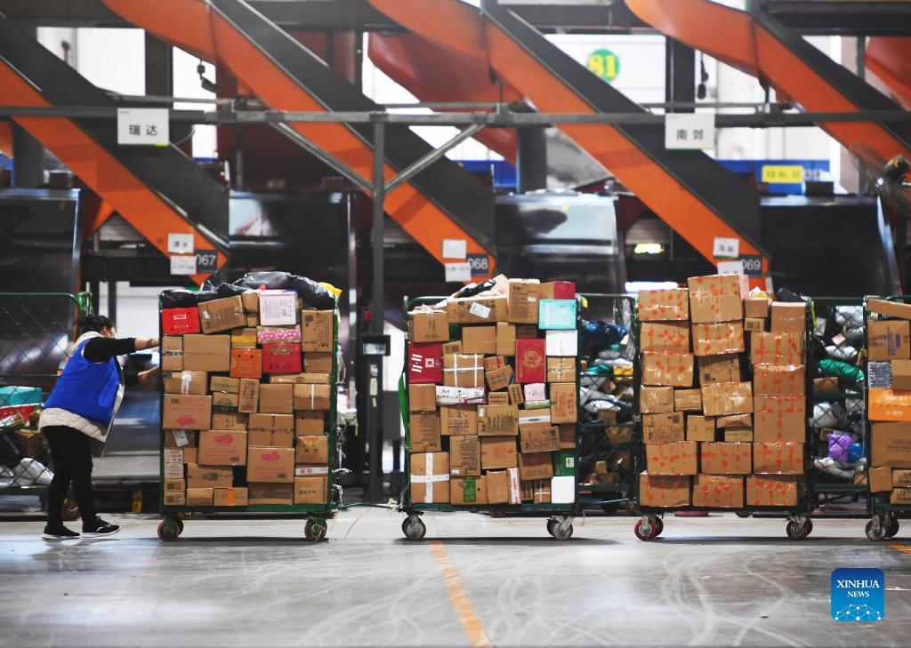 Staff members transport packages at a logistics center in Zhengzhou, central China's Henan Province, Nov. 11, 2021. With orders pouring in at midnight Wednesday, this year's Singles' Day shopping spree peaked on multiple e-commerce platforms in China. During the online shopping festival, logistics companies have taken measures to ensure the package delivery. (Xinhua/Zhang Haoran)