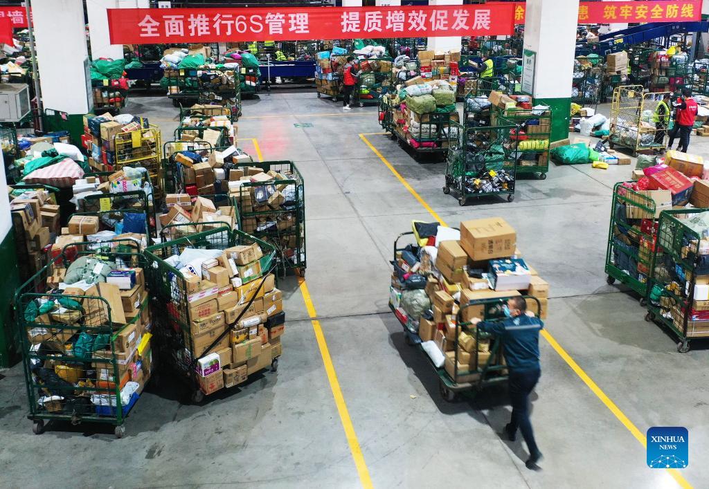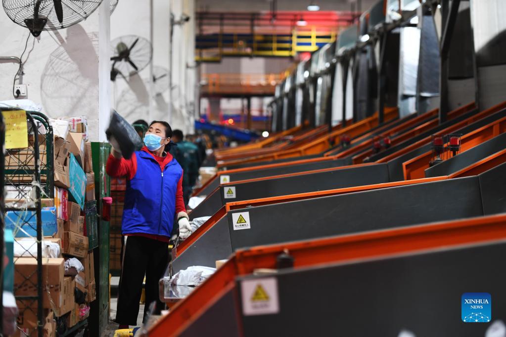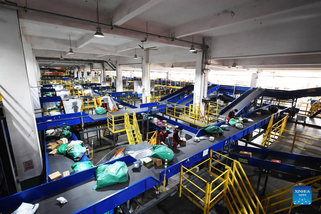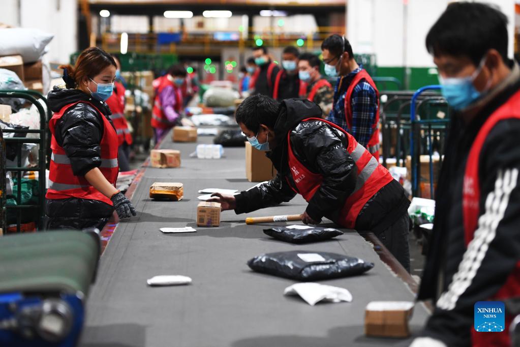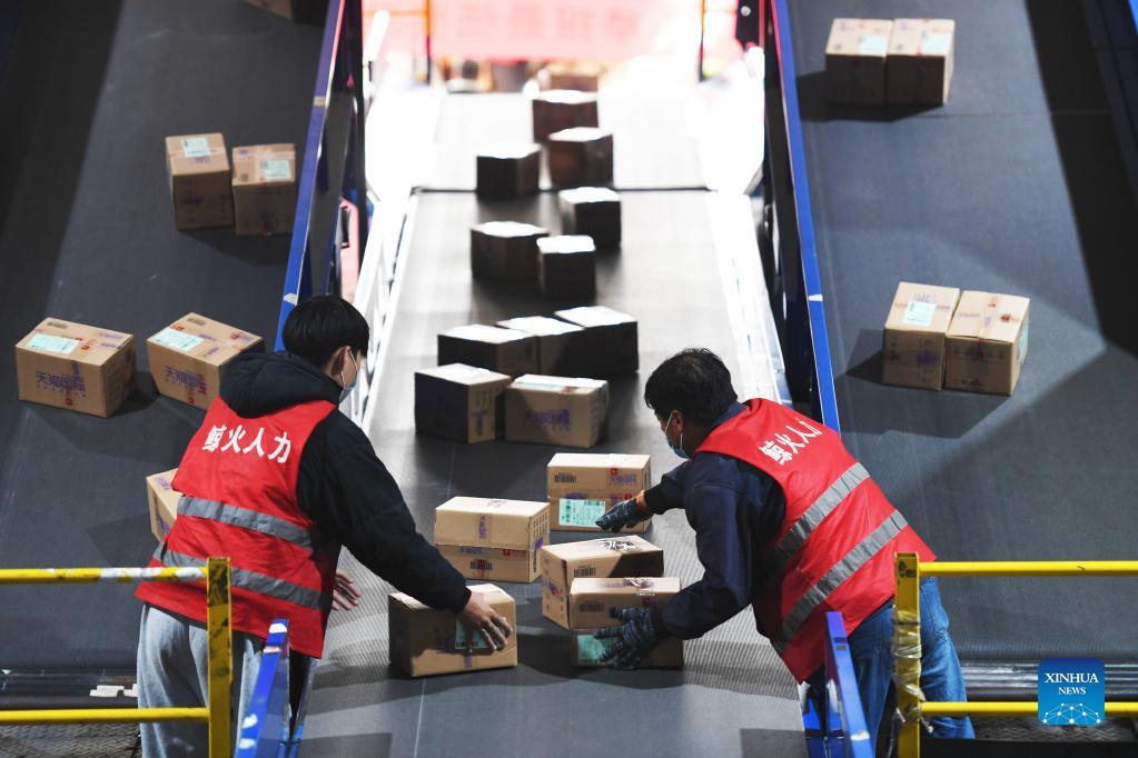 Staff members sort packages at a logistics center in Zhengzhou, central China's Henan Province, Nov. 11, 2021. With orders pouring in at midnight Wednesday, this year's Singles' Day shopping spree peaked on multiple e-commerce platforms in China. During the online shopping festival, logistics companies have taken measures to ensure the package delivery. (Xinhua/Zhang Haoran)