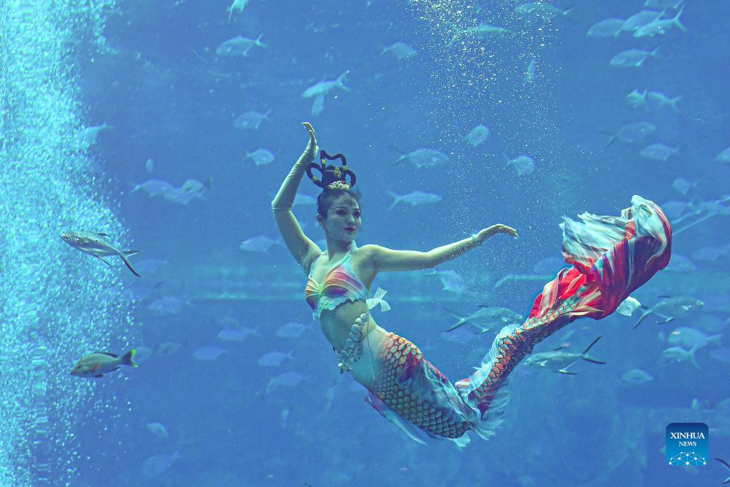 A contestant participates in a mermaid contest in Sanya, south China's Hainan Province, Dec. 21, 2021. Over 40 contestants participated in the contest which kicked off Tuesday. (Xinhua/Pu Xiaoxu)