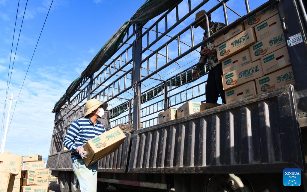 A staff member of a fruit company loads Hami melons onto a truck in Foluo Town of Ledong County, south China's Hainan Province, Dec. 29, 2021. Over 48,000 mu (about 3,200 hectares) of Hami melons have entered harvest season in Ledong County. With the yearly output of more than 200,000 tonnes, Hami melon planting business has become an important industry in increasing the incomes of local villagers. (Xinhua/Yang Guanyu)