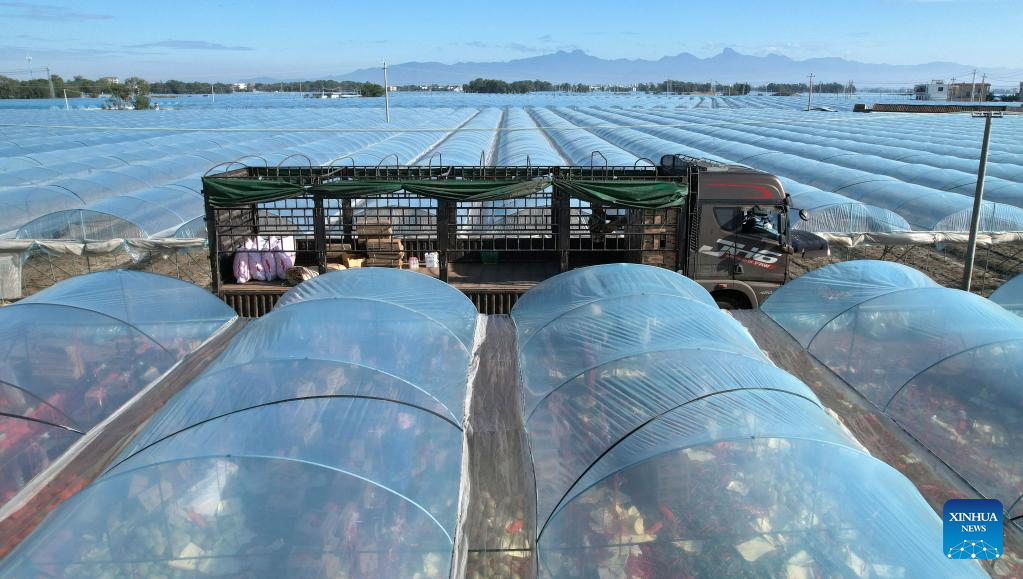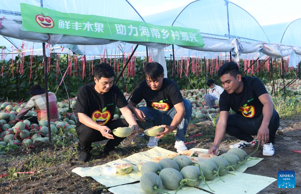 Farmers pick Hami melons in Foluo Town of Ledong County, south China's Hainan Province, Dec. 28, 2021. Over 48,000 mu (about 3,200 hectares) of Hami melons have entered harvest season in Ledong County. With the yearly output of more than 200,000 tonnes, Hami melon planting business has become an important industry in increasing the incomes of local villagers. (Xinhua/Yang Guanyu)