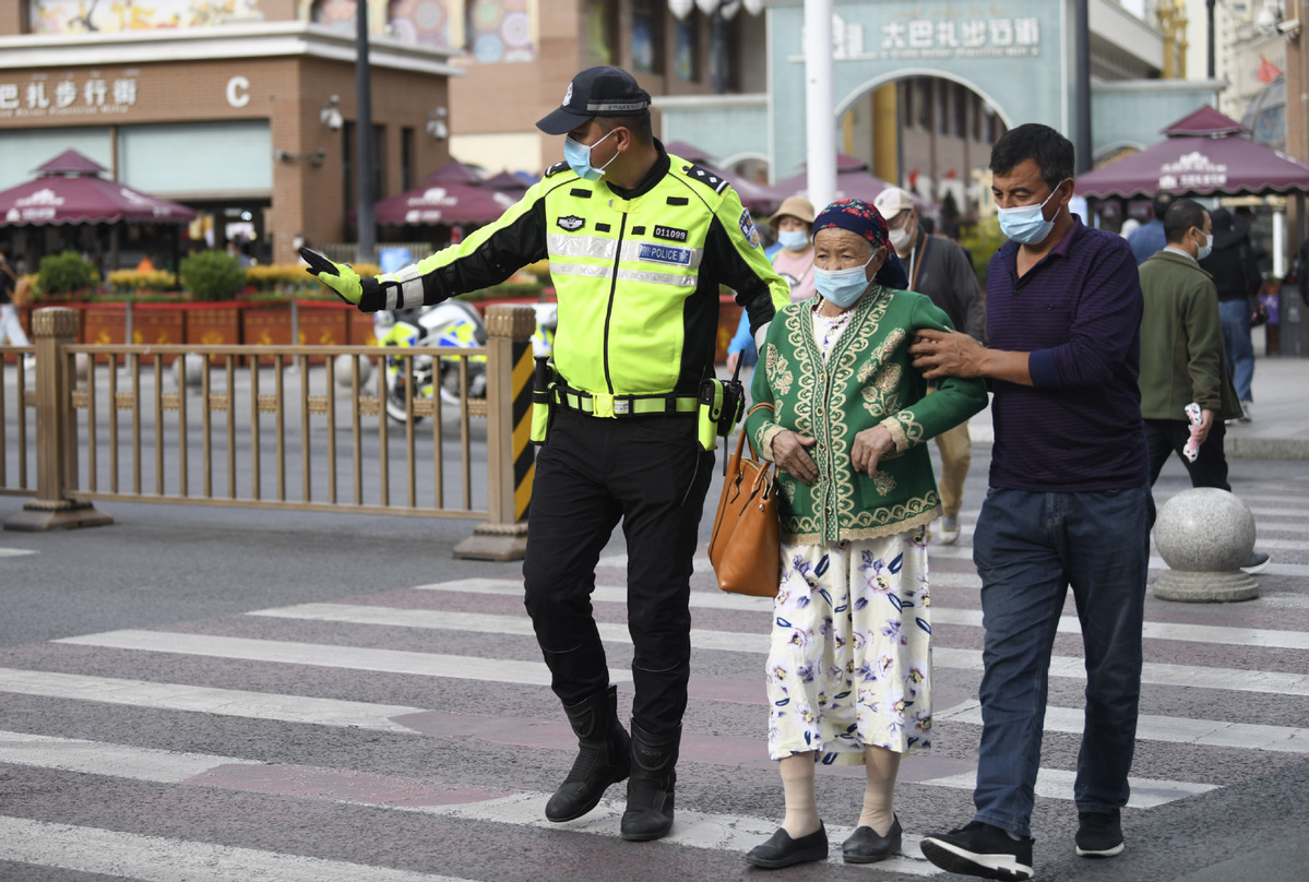 A policeman helps a senior citizen cross a road in Urumqi, Xinjiang Uygur autonomous region, on Oct 1, 2021. [Photo/Xinhua]