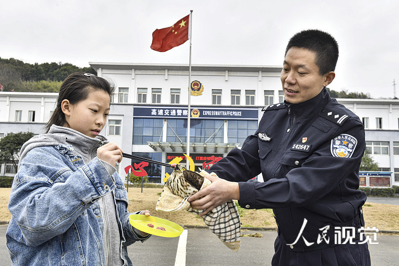 Policeman Ding Jian and his daughter feed an injured bird in Shaoxing, East China's Zhejiang province, on Jan 8, 2022. [Photo/VCG]