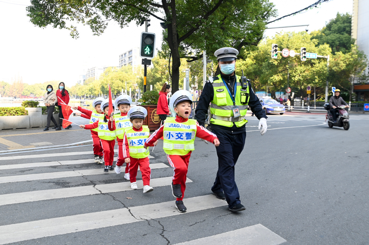 A policeman guards pupils across a road in Nanchang, East China's Jiangxi province, on Nov 29, 2021. [Photo/IC]