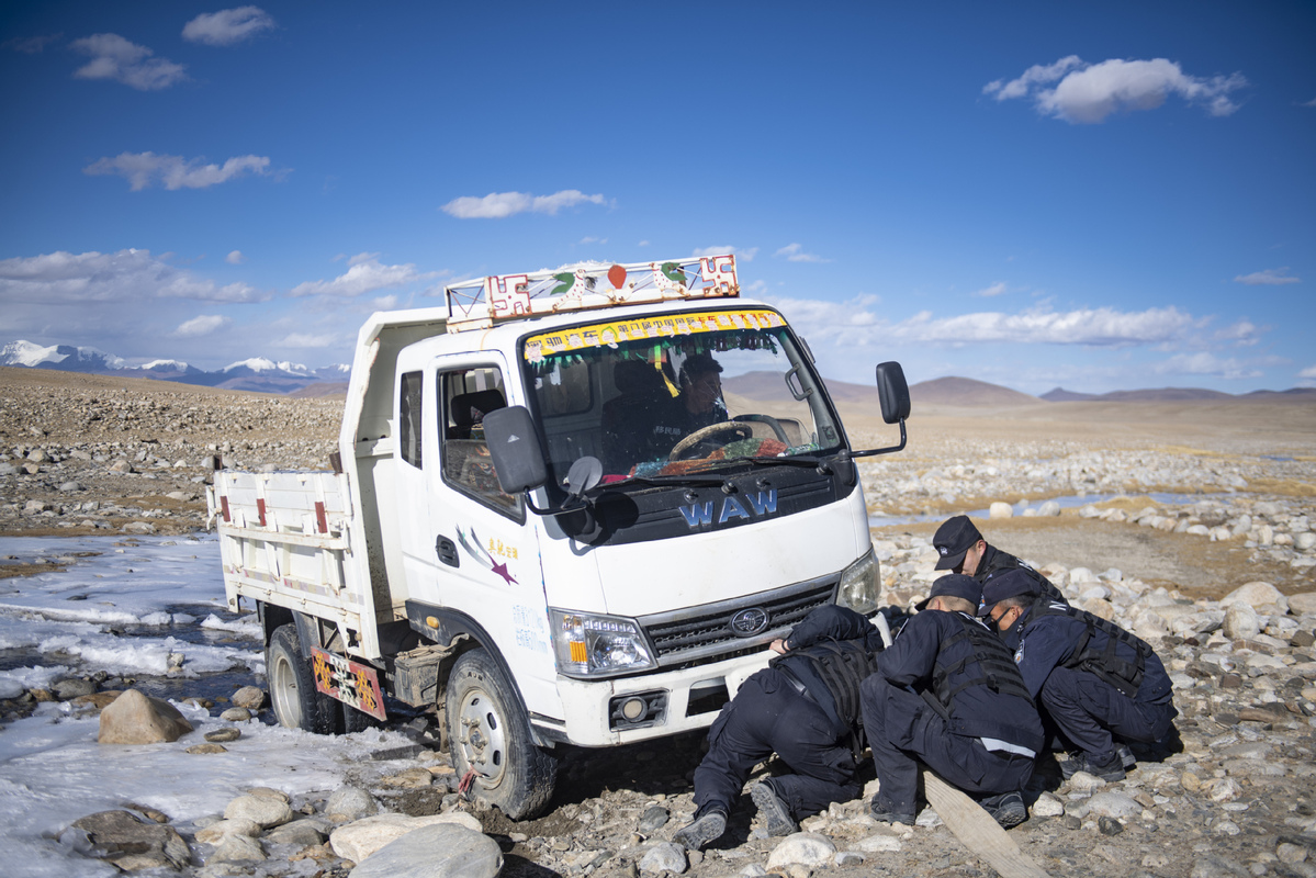 Policemen help a local herdsman drive his truck out of a frozen creek in Langkazi county of Shannan, Tibet autonomous region, on Nov 20, 2021. [Photo/Xinhua]