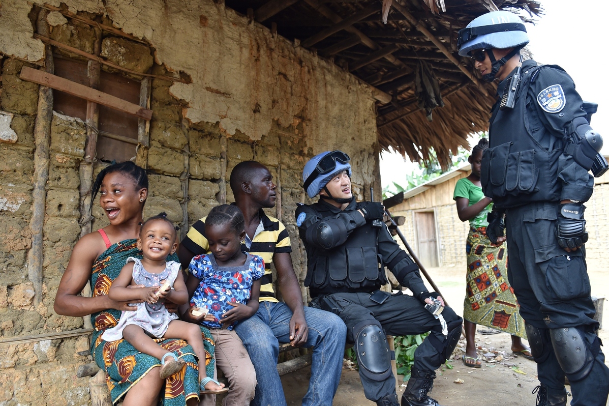 Chinese peacekeeping policemen are on patrol in a village in Liberia on Nov 3, 2015. [Photo/Xinhua]