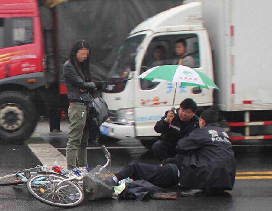 Two policemen hold an umbrella over the injured people after a traffic accident in Jiangdu district of Yangzhou, East China's Jiangsu province, on Oct 30, 2014. [Photo/IC]