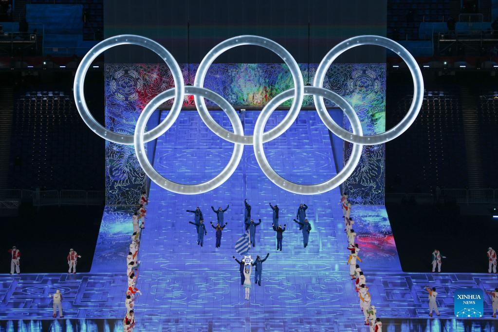 The Olympic delegation of Greece parade into the National Stadium during the opening ceremony of the Beijing 2022 Olympic Winter Games in Beijing, capital of China, Feb. 4, 2022. (Xinhua/Yang Lei)