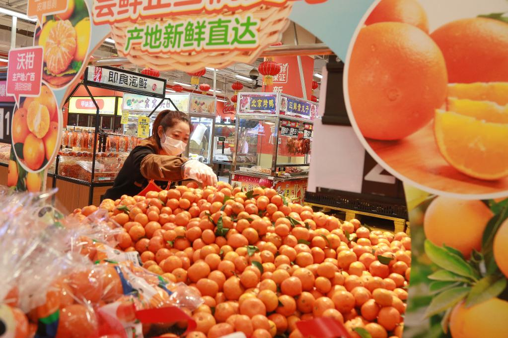 A staff member works at a supermarket in Bijie, southwest China's Guizhou Province, Feb. 16, 2022. China's inflation was further tamed in January as food prices saw a decline, while price retreats in coal and steel sectors prompted factory-gate inflation to moderate, official data showed Wednesday. The consumer price index (CPI), a main gauge of inflation, rose 0.9 percent year on year in January, down from the 1.5-percent increase a month ago, data from the National Bureau of Statistics (NBS) showed. (Photo by Wang Chunliang/Xinhua)