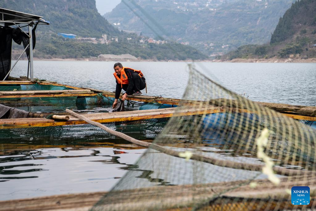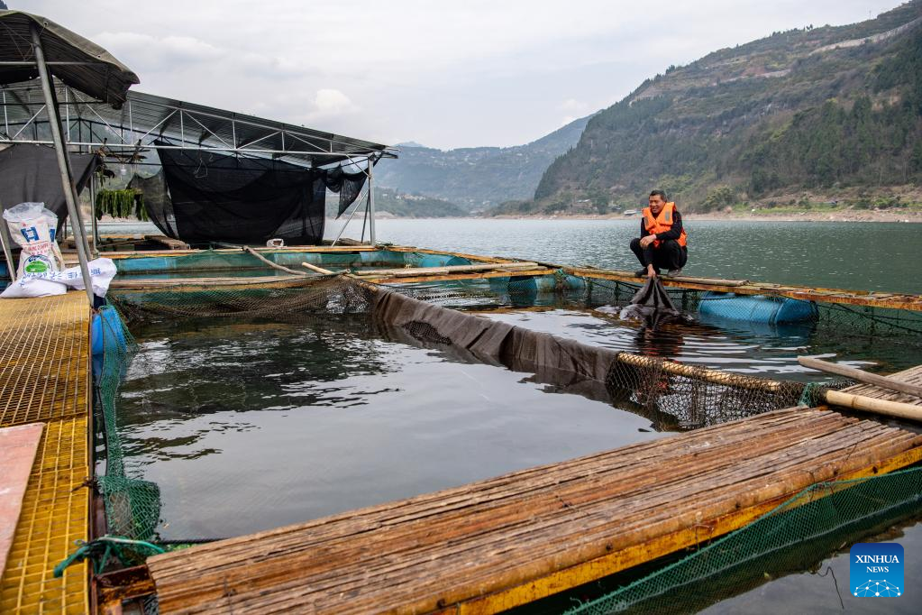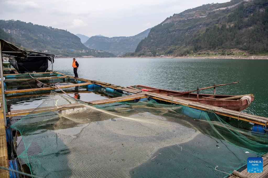 Photo taken on Feb. 25, 2022 shows a breeding base for rare fishes in the Three Gorges Reservoir in southwest China's Chongqing.