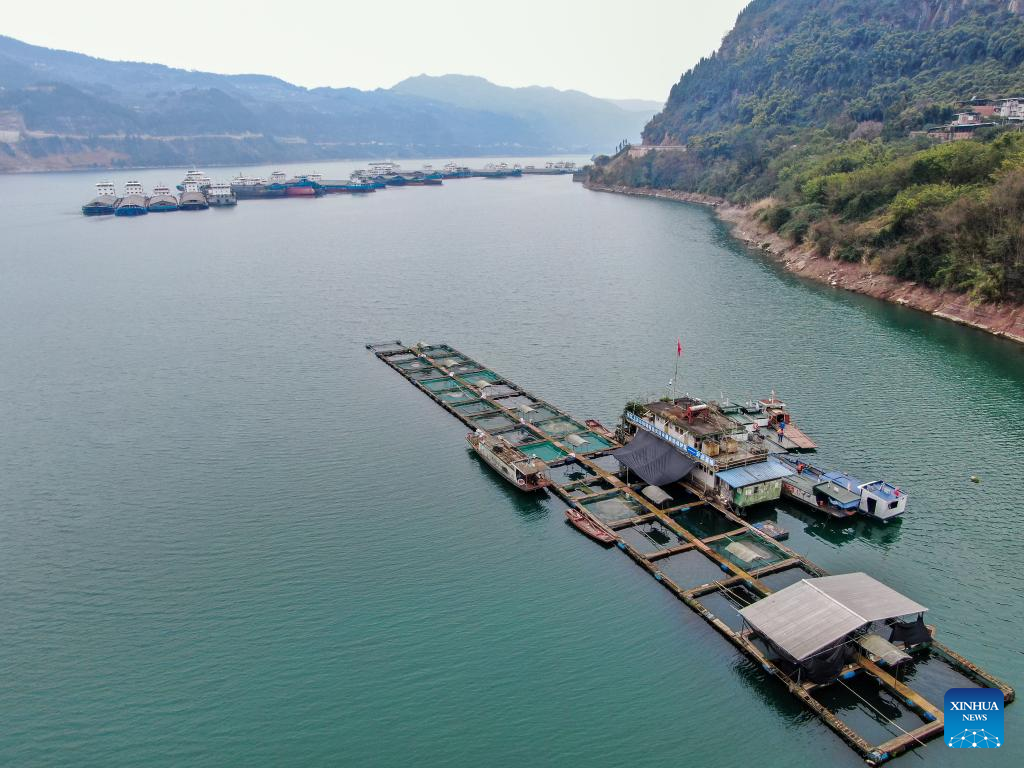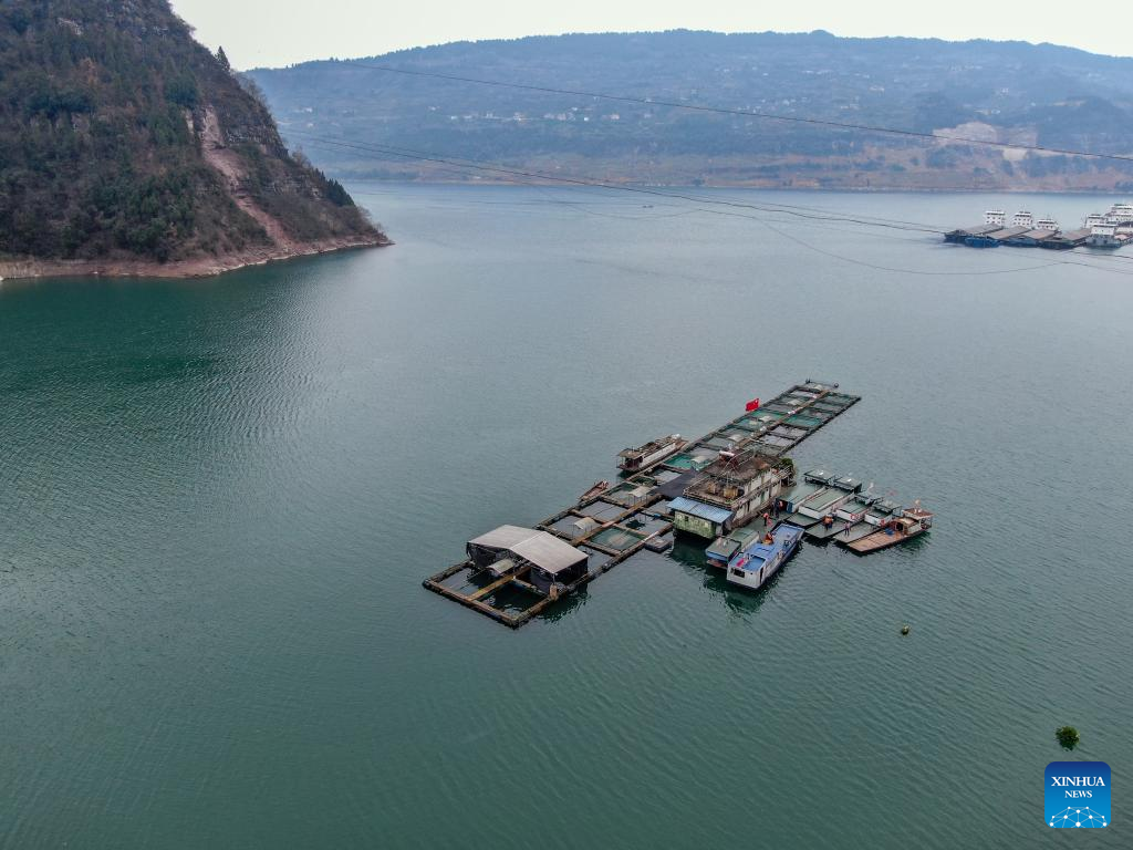 Aerial photo shows a breeding base for rare fishes in the Three Gorges Reservoir in southwest China's Chongqing, Feb. 25, 2022.