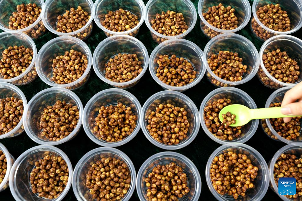 Fried beans are served to students at a primary school to greet the Longtaitou Day in Zaozhuang, east China's Shandong Province, March 3, 2022. Literally meaning "dragon raises head", the day of Longtaitou, the second day of the second lunar month, falls on Friday this year. Various activities were held to greet the day. (Photo by Sun Zhongzhe/Xinhua)