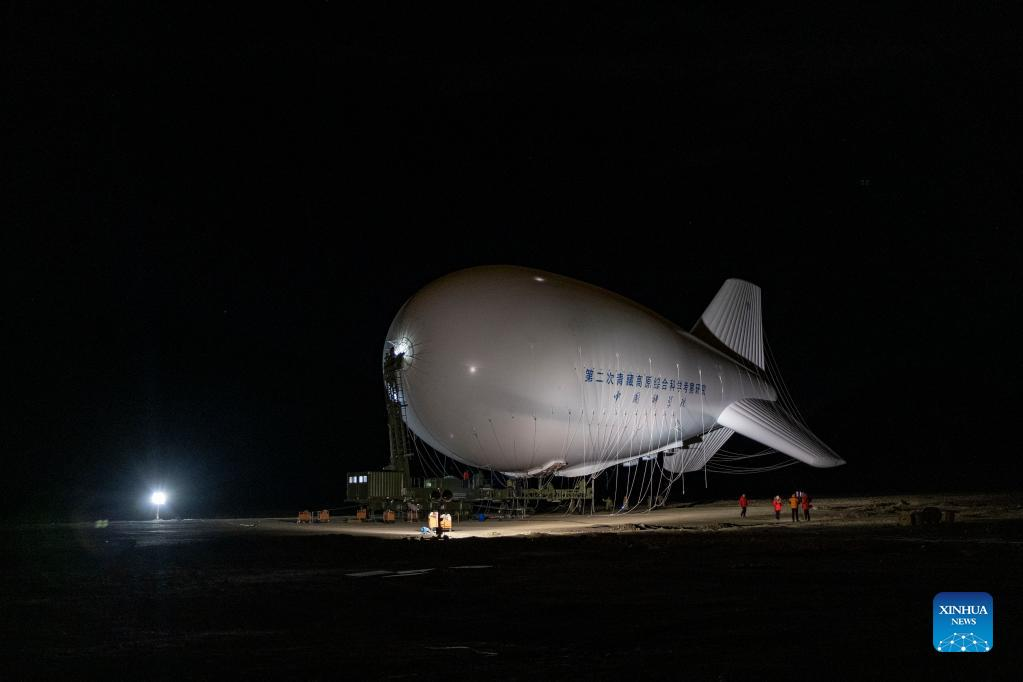 Floating airship "Jimu No.1" type III is about to lift off in Zhaxizom Township of Tingri County, southwest China's Tibet Autonomous Region, May 15, 2022. China's self-developed floating airship, designed for atmosphere observation, reached a record altitude of 9,032 meters in Tibet Autonomous Region on Sunday, according to its developer. Developed by the Aerospace Information Research Institute of the Chinese Academy of Sciences (CAS), the floating airship "Jimu No.1" type III has a volume of 9,060 cubic meters. (Xinhua/Sun Fei)