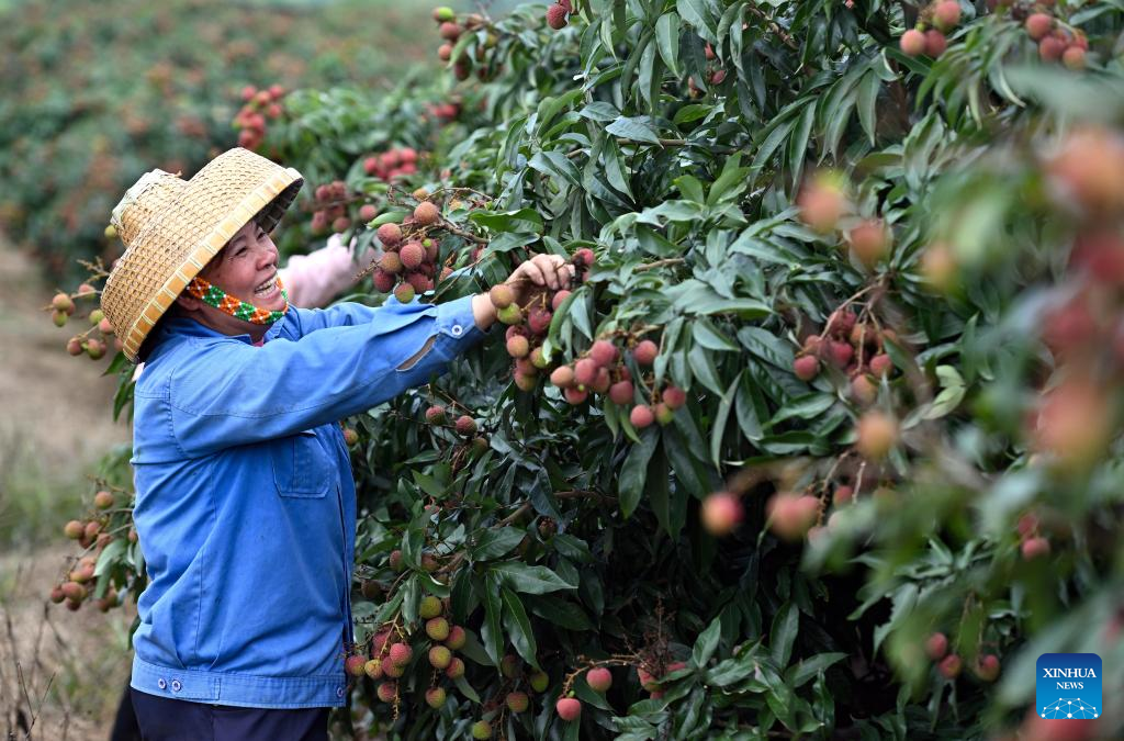 A farmer picks litchi at Dafeng Town in Chengmai County, south China's Hainan Province, May 19, 2022. Harvest season for litchi has come in Chengmai County. (Xinhua/Guo Cheng)