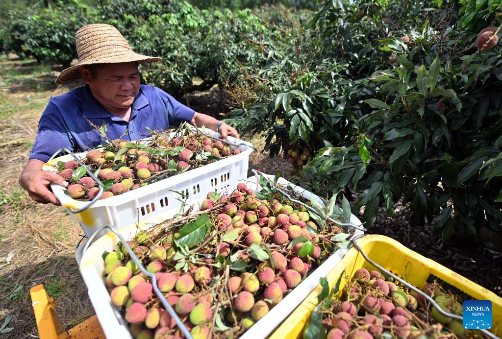 A farmer loads litchi at Dafeng Town in Chengmai County, south China's Hainan Province, May 19, 2022. Harvest season for litchi has come in Chengmai County. (Xinhua/Guo Cheng)