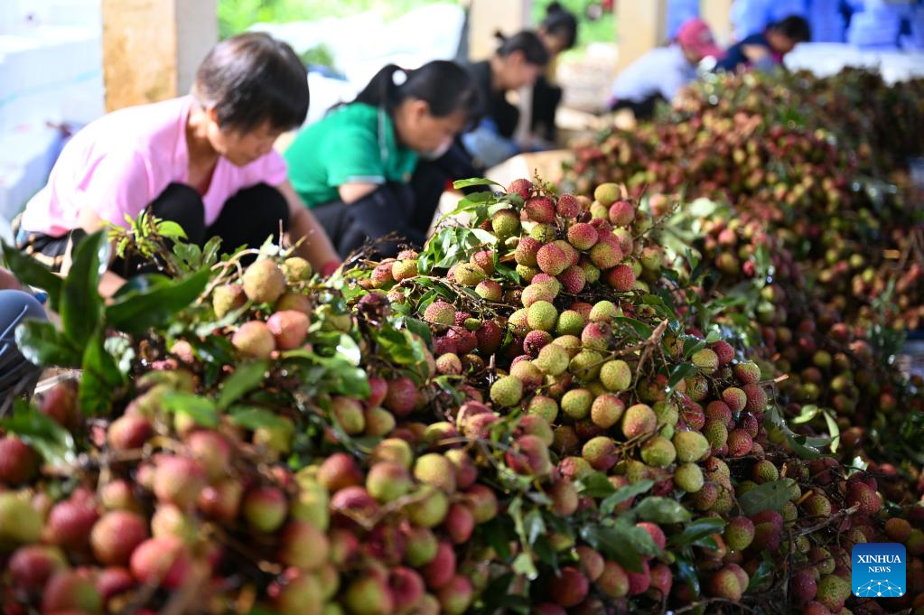 Workers sort out litchi at Dafeng Town in Chengmai County, south China's Hainan Province, May 19, 2022. Harvest season for litchi has come in Chengmai County. (Xinhua/Guo Cheng)