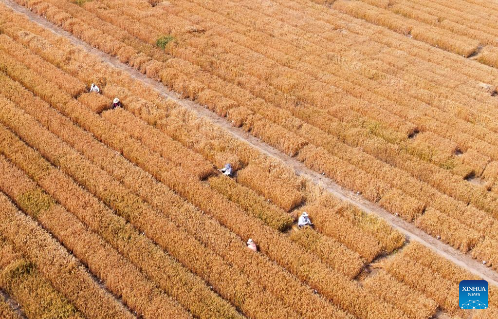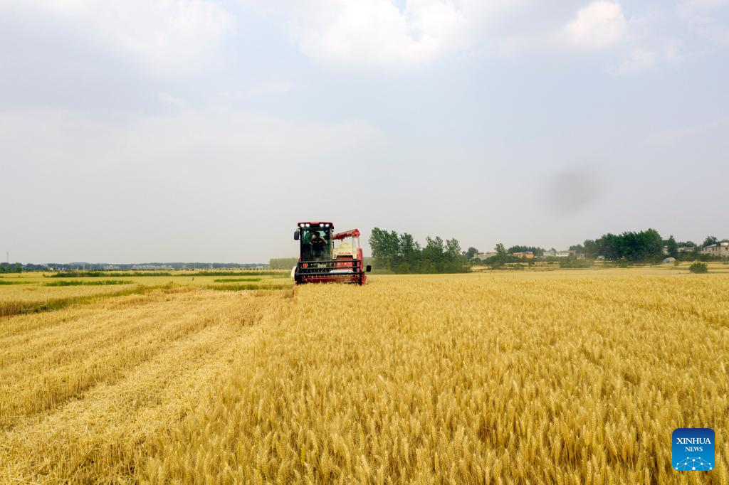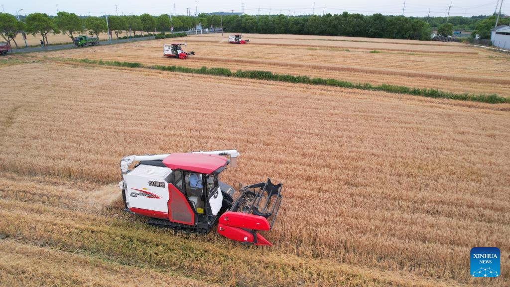 Aerial photo shows farmers harvesting wheat in the fields in Yangzhou, east China's Jiangsu Province, May 21, 2022. (Photo by Meng Delong/Xinhua)
